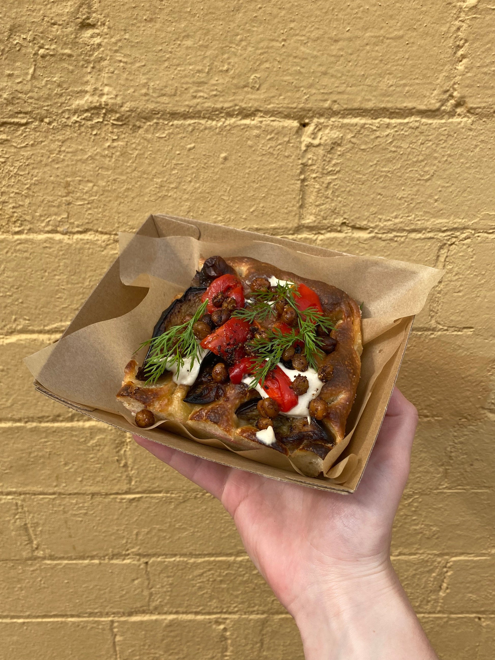 Soft focaccia layered with braised organic eggplant, creamy house-made tahina sauce, sweet confit capsicum, crispy sumac chickpeas, topped with soft herbs.